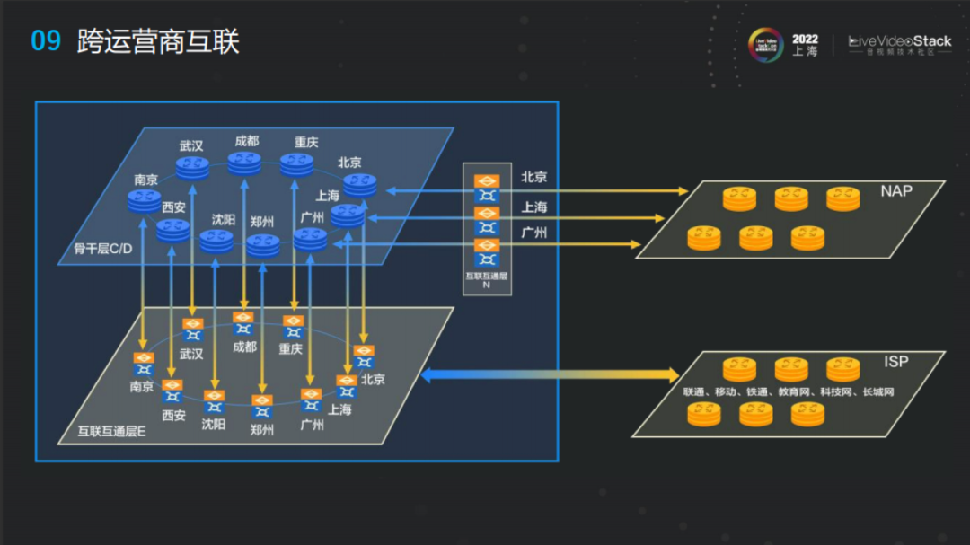 鉴于运营商的省公司是独立运作的,互相之间的互联经常有不确定性。如果两个省挂接在不同的全国核心下方,路径显然会更长,跨区实际上是长途跋涉。我们做CDN就是应对这种网络情况,在一个复杂的网络拓扑中寻找一条相对靠谱、质量好一点的路去把数据传输过去。我们一般是认为资源下沉到同省是一个从成本和质量上比较平衡的做法,因为同省内的互联是比较有保障的,那么跨中心就已经不太靠谱。如果进一步,我们想要跨运营商呢?