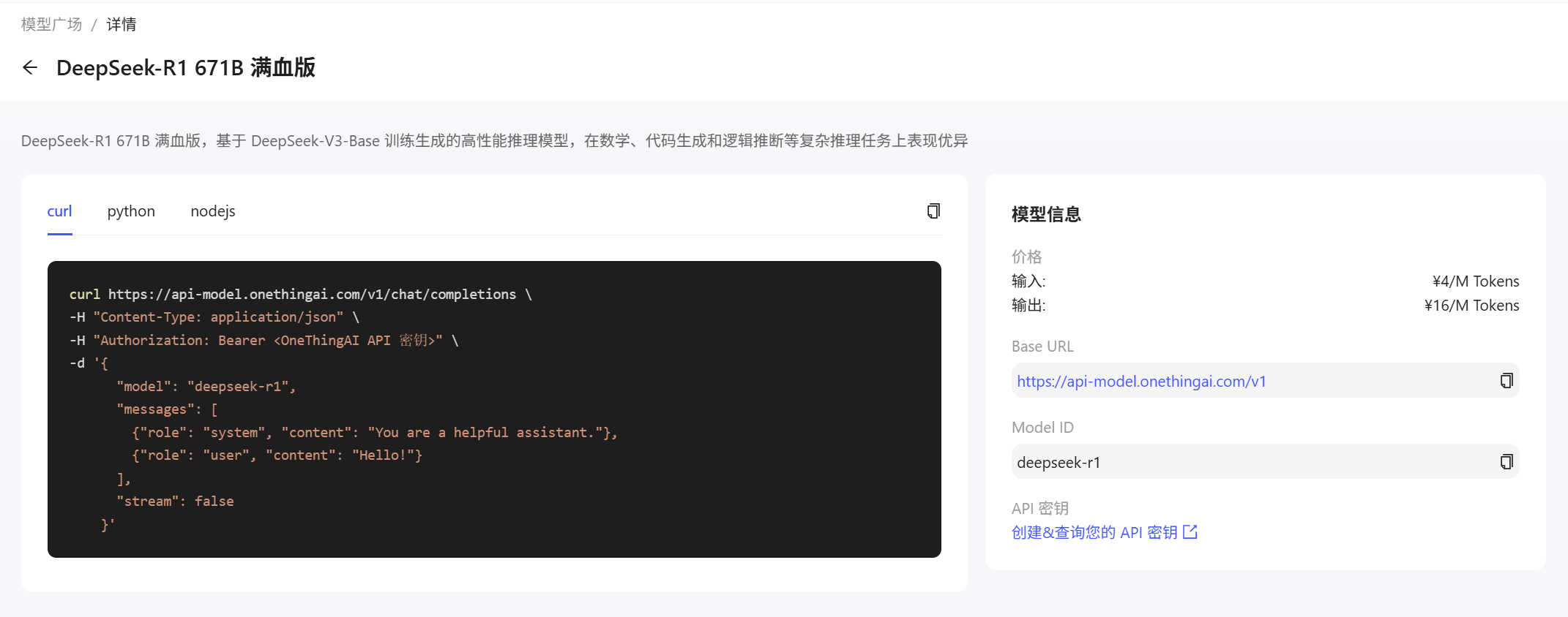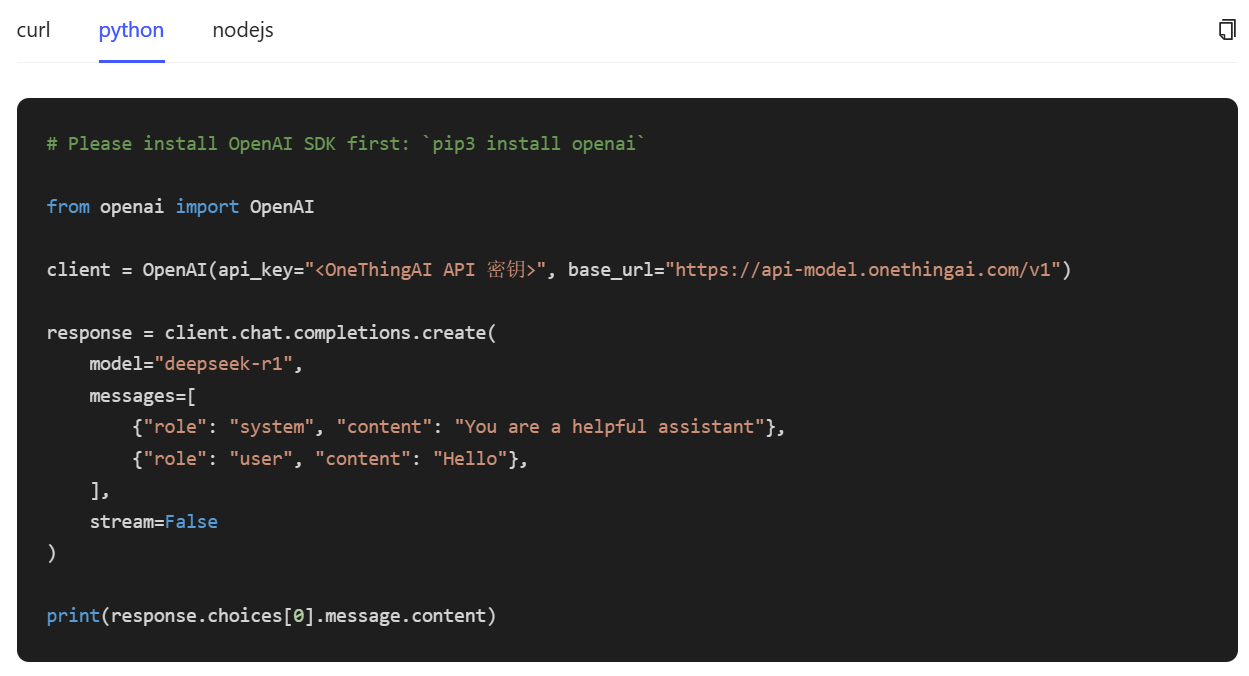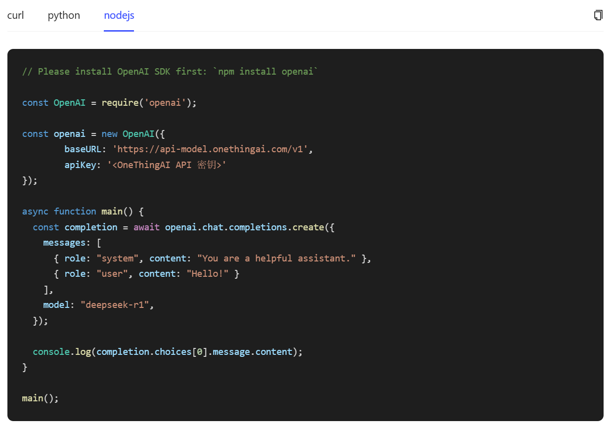 步骤三:给予curl、Python、Node.js三种技术方案,实现与模型API(如 DeepSeek - R1 模型接口)的交互,满足多样化开发场景及开发者使用习惯。