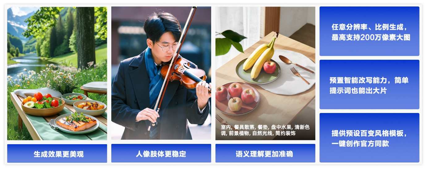 具备分析图片内容并生成创意描述的能力,还可极速生成细节丰富的图像,生成效率高。在艺术创作、影视概念设计、质感人像、广告设计等场景中表现出色。