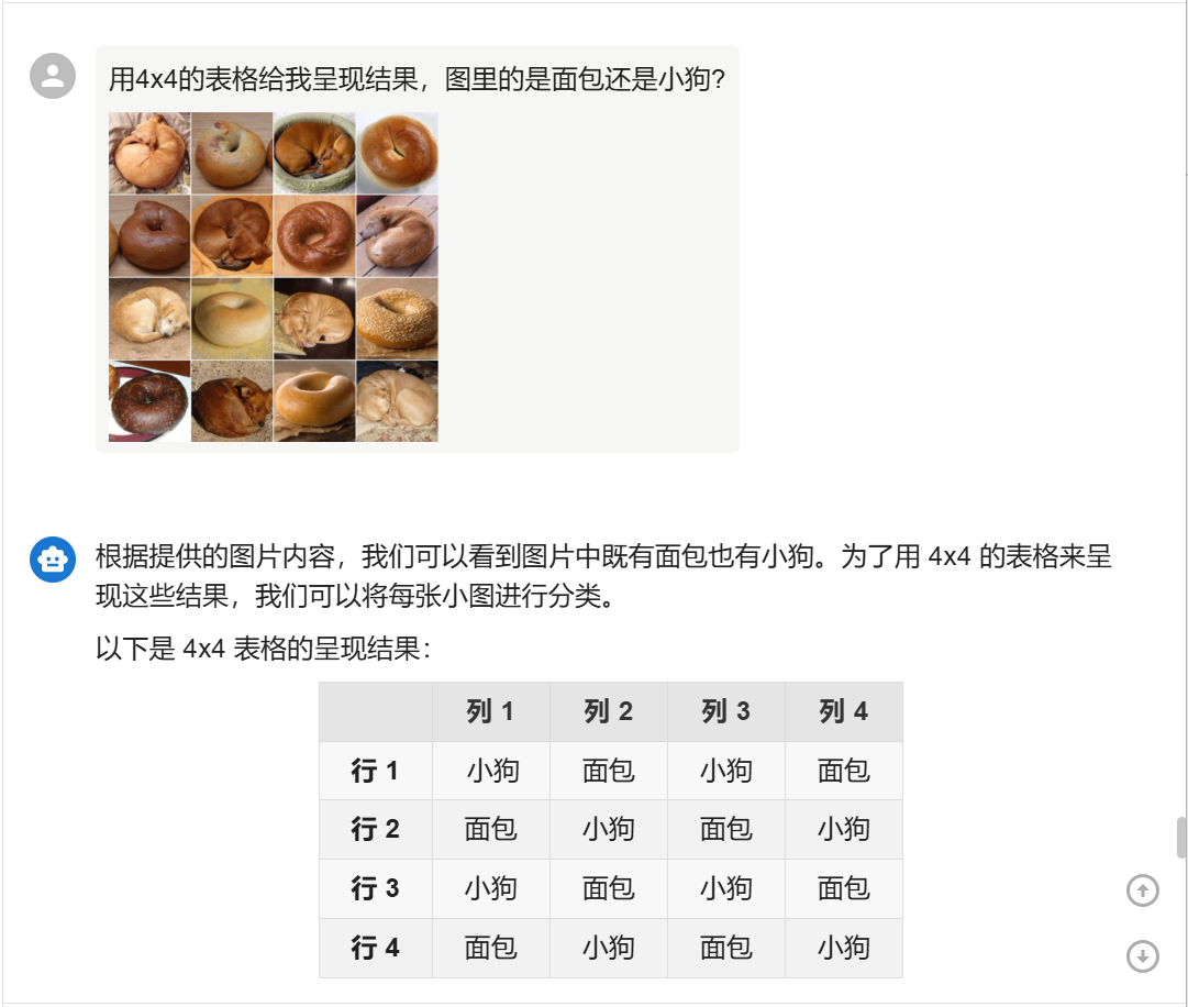下图示例中,我们拼凑了16张相似的人眼较难区分的面包和小狗图片,借助OneThingAI平台的Qwen-2.5-VL系列模型来识别并按顺序标记图片类型。结果显示,无论是面包还是小狗,模型都能精确地区分和识别。
