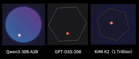 在编程能力测试中,GPT-OSS-20b 也顺利顺利获得了小球物理共振测试,对比 Qwen3-30B-A3B 和 KIMI K2 的生成效果来看,它的表现实在超出了20b 模型参数的预期,甚至与那些参数是它十几倍的模型表现不相上下!