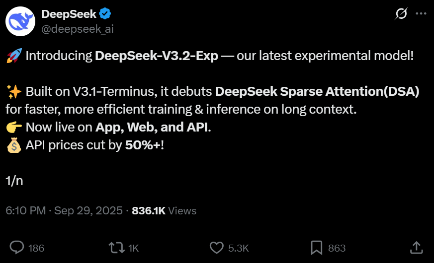 昨晚,DeepSeek-V3.2-Exp模型正式发布并开源,evo视讯官网算力云已首发接入!
