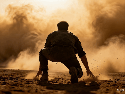 提示词:在沙漠中,男人从地面蓄力后猛然冲向沙尘暴,最后被沙尘暴吞没,镜头紧贴背后跟随,高速运动中出现轻微拖影与尺度变化,增强真实感。接着转场,夜幕降临,周围一片寂静,一只手从沙漠上伸出来。写实电影质感,真实反射与体积雾;动作流畅,速度曲线明显,整体紧张刺激与沉浸感强。