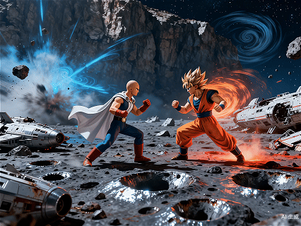 提示词:两人同时挥拳猛烈相撞并持续 3 秒,瞬间掀起强烈气流与能量波动、致衣角飞舞及地面震裂,随后战斗全面爆发,二人以迅猛陆续在的动作拳脚交织,镜头在拳头碰撞瞬间剧烈震动后稍作后仰,再快速切入近身搏斗并以手持感跟随两人移动、左右摆动增强冲击感,背景设定为月球地表(周围有飞船残骸、地表裂痕,远处岩壁模糊晃动,空气残留气流扰动和能量光痕),画面采用写实电影质感。
