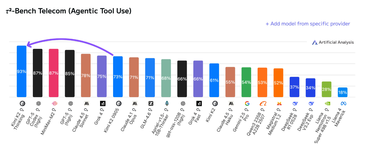 Artificial Analysis 数据显示,Kimi K2 Thinking 在 τ²-Bench Telecom(智能体工具使用基准)中得分 93% ,为独立测量的最高值。其在智能体场景中的工具使用能力上较前代有显著提升,支持自主 200 - 300 轮工具调用和多轮思考。[1]