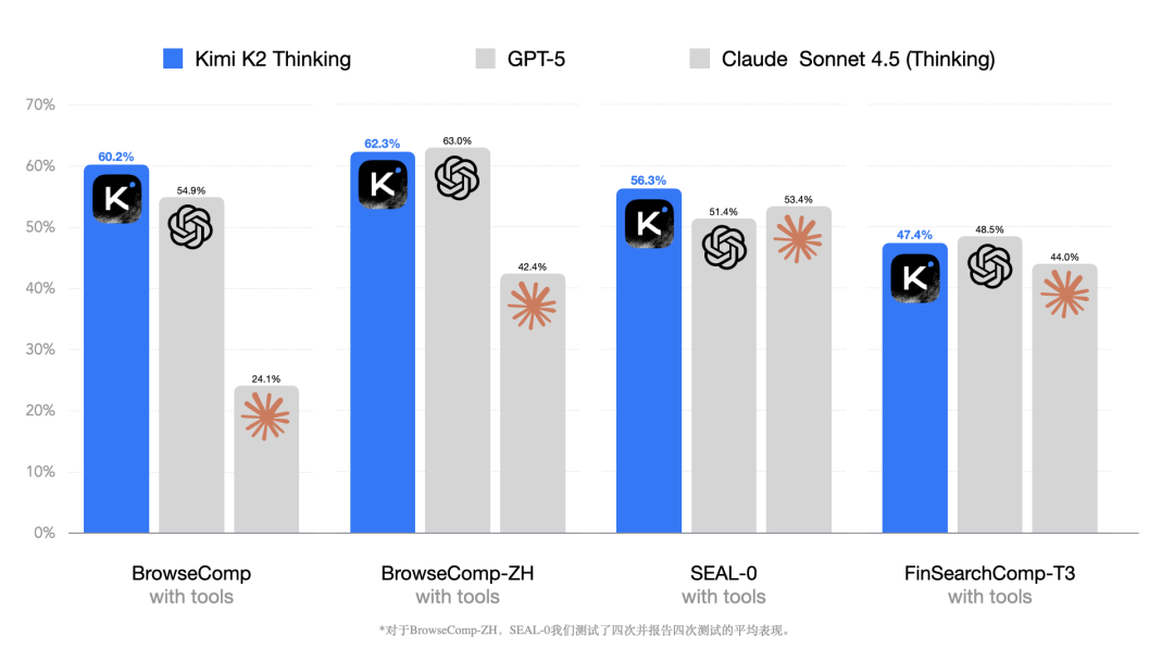 在 Open AI 的 BrowseComp 基准测试中,Kimi K2 Thinking 以 60.2% 的成绩拔得头筹。模型尤其擅长“刨根问底”,分解模糊问题,顺利获得“思考→搜索→验证”循环获取精准结果。
