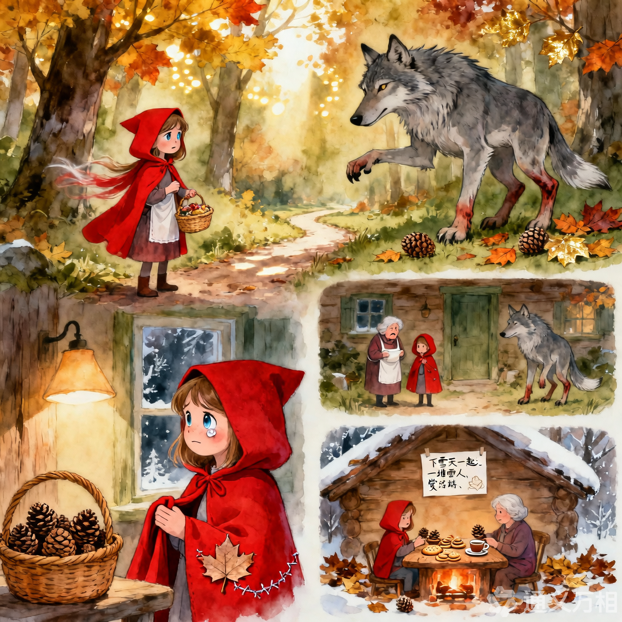 我想创作一个关于“回忆”的绘本,主角小红帽戴着红斗篷、提着点心篮、和皮毛灰扑扑、腿脚略跛的老狼灰鬃。冬日前,小红帽和外婆围坐在小木屋烤点心。突然,小红帽回忆秋日里,她在前往外婆家的路上遇到老狼灰鬃,老狼灰鬃对她伸出利爪,要不是外婆撞见灰鬃大声劝阻,自己危险了。想到这里,小红帽不禁落下了眼泪。